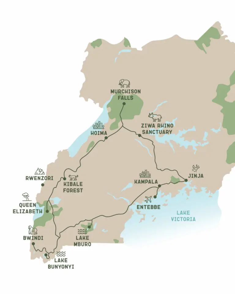 Die Planung eines Roadtrips durch das beeindruckende Uganda kann überwältigend erscheinen. Deshalb hat unser erfahrenes Travelbase Nomads-Team eine sorgfältig ausgearbeitete Route für dich zusammengestellt. Egal, ob du durch weitläufige Savannen, üppige Regenwälder oder entlang ausgedehnter Seen fährst, du musst einfach nur die Freiheit des Reisens genießen.